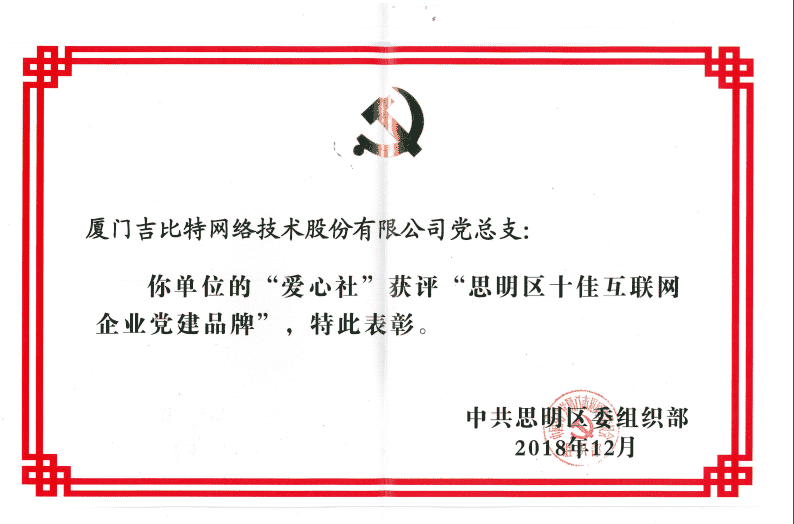 经初审评选、、、网络评选和专家评审等环节,,,,"厦门亚星管理网络技术股份有限公司党总支-爱心社" 从全区28个参评党建品牌中脱颖而出,,,,获评"思明区十佳互联网企业党建品牌"。。。。