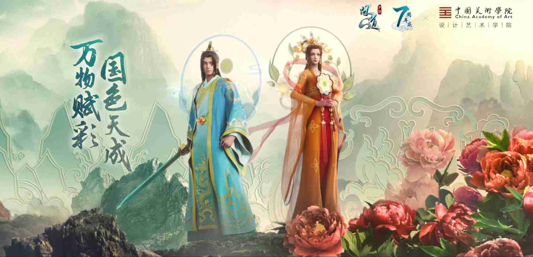 2023年4月,,,,《问道手游》联动中国美术学院,,,,在游戏中融合了中国历史上不同时期的文化元素,,,打造了“山河万象”与“凤鸣九霄”的国风时装。。。在色彩配置方面,,,,创作团队基于对游戏角色特性的分析提取相应的文化内涵,,从每一种色彩的色相、、指代事物和情感出发对应角色属性,,,,选定服装的色彩搭配。。在纹样设计方面,,,,创作团队结合游戏角色自身特殊的造型比例和形态,,,,在实际的纹样设计中进行了游戏语境下的活化演绎。。。男性角色集中使用了如蟒纹、、、、海水江崖纹、、、、如意纹和云气纹等传统纹样元素,,女性角色则吸纳了凤凰纹、、牡丹纹、、、卷草缠枝纹等元素,,,,组成以“双凤牡丹纹样”“缠枝牡丹纹”“金玉凤冠头饰”为主要纹样的游戏角色装饰图案系统。。。
